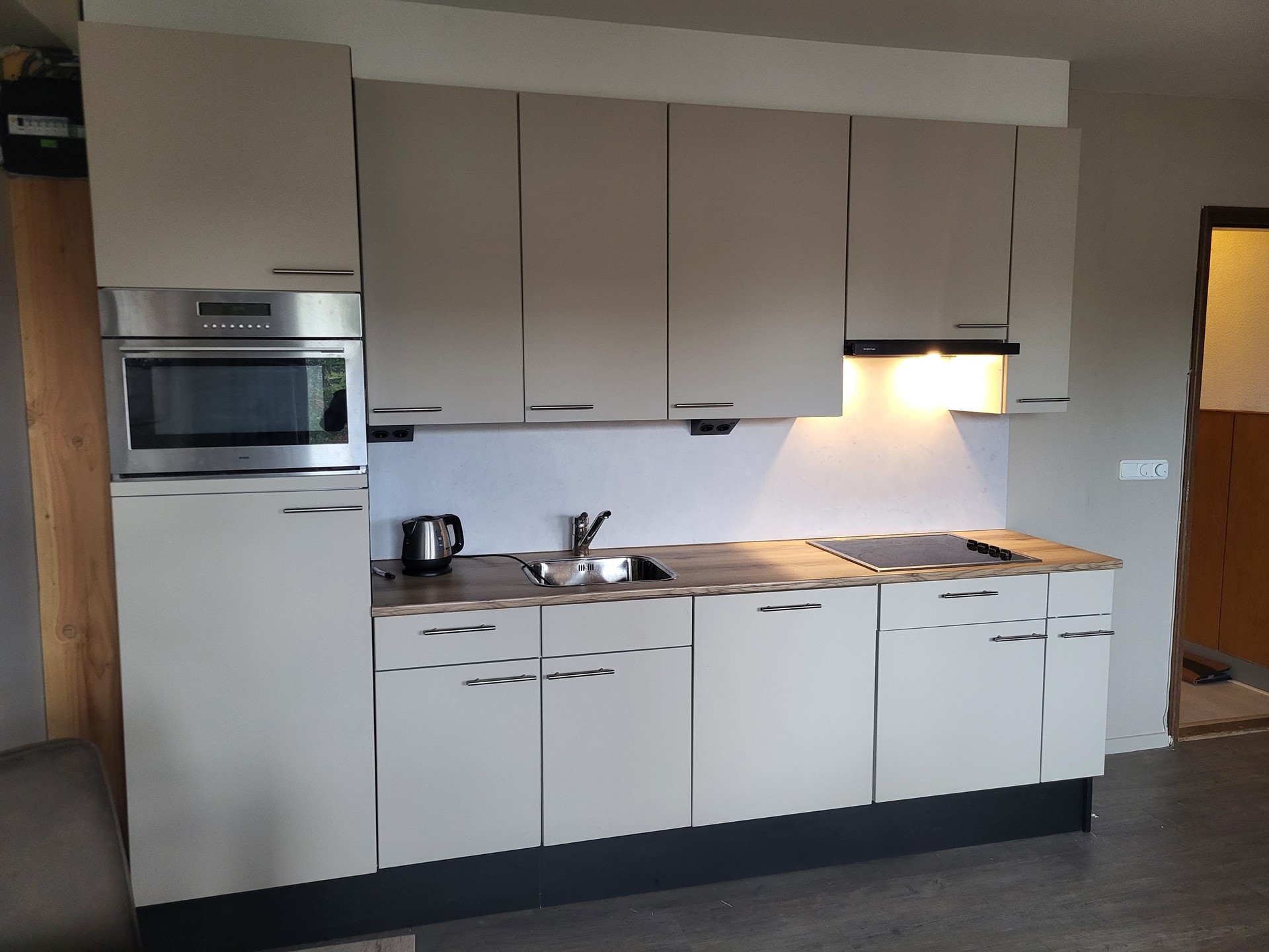 The living room with open kitchen faces the street and is approximately 25 m². The kitchen is equipped with a 4-burner stove, extractor hood, built-in refrigerator, combination oven, and washing machine. Adjacent to the kitchen is the approximately 6 m² bathroom. It features a spacious bath/shower combination, vanity, and wall-hung toilet. The spacious bedroom of approximately 13 m² is located at the rear of the apartment and is accessible from both the hallway and the bathroom.