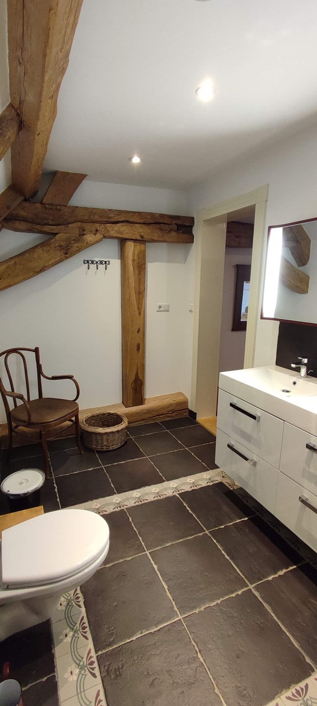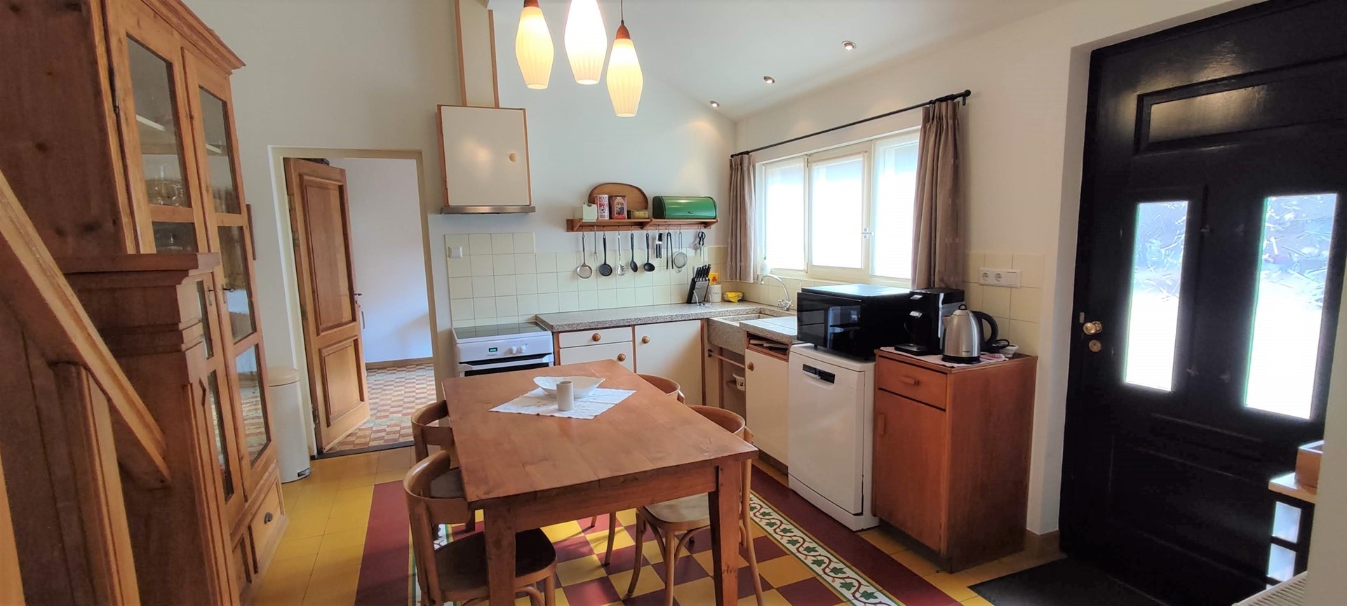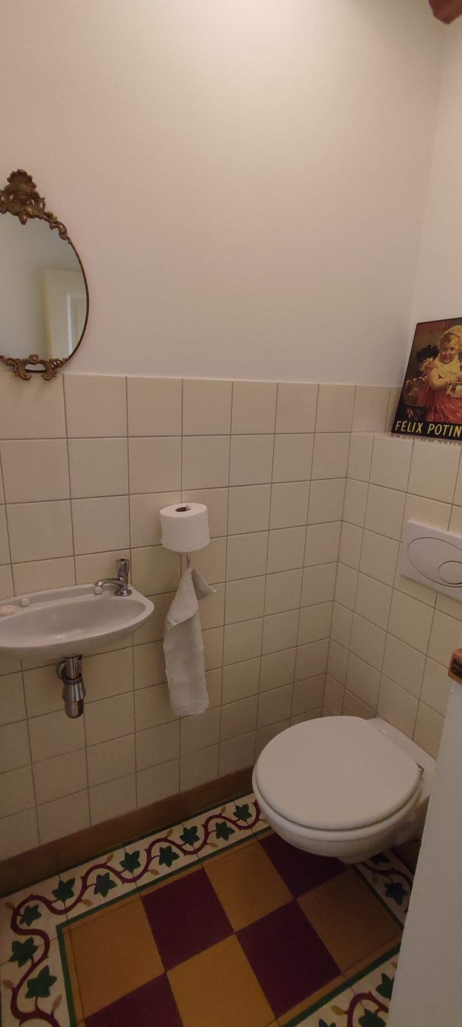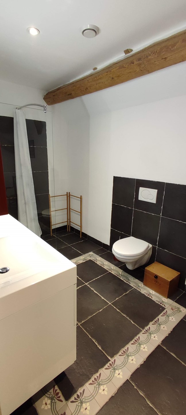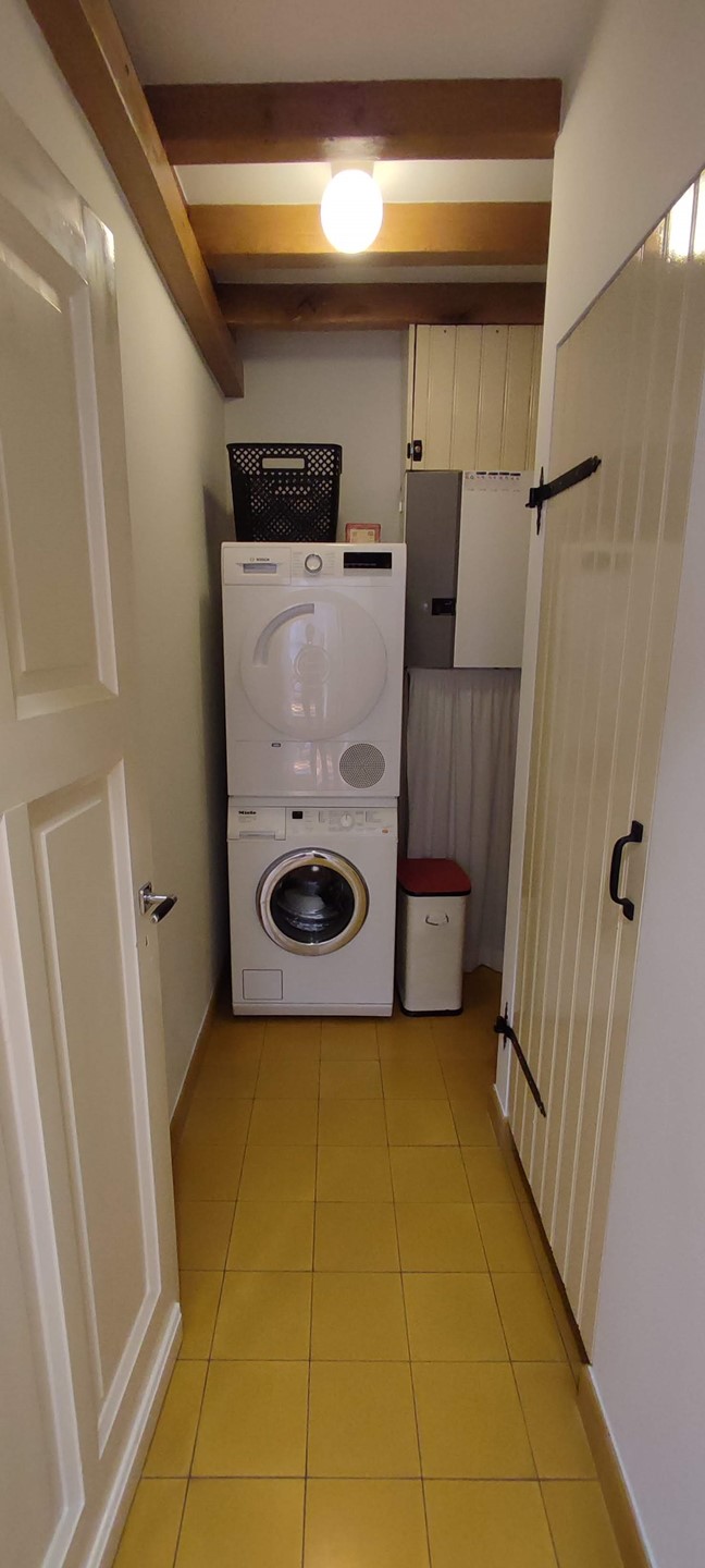 Entrance hall with toilet, laundry room with washer/dryer, and wardrobe. Charming living room (20m²) with beautiful original trusses overlooking the courtyard. The spacious kitchen/diner (16m²) is equipped with the following appliances: refrigerator, freezer, dishwasher, oven, 4-burner stove, and extractor hood.