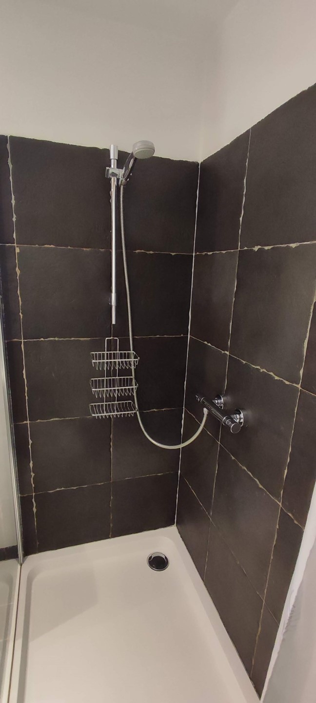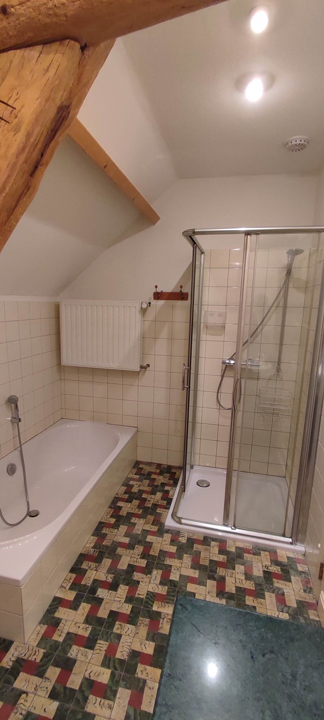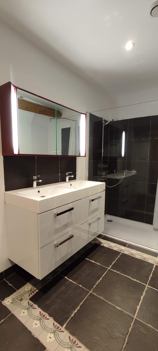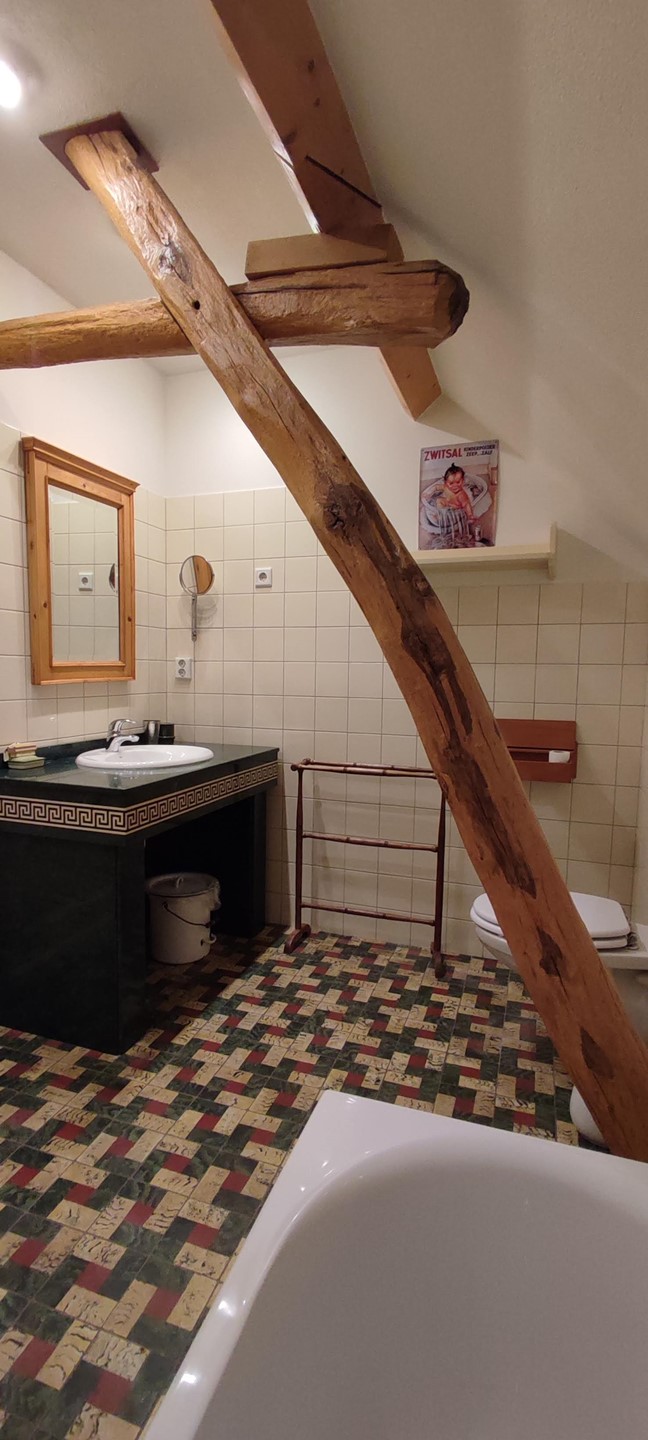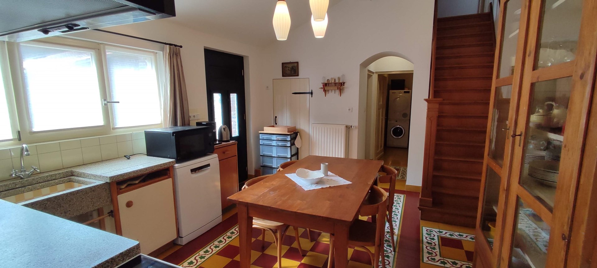 Entrance hall with toilet, laundry room with washer/dryer, and wardrobe. Charming living room (20m²) with beautiful original trusses overlooking the courtyard. The spacious kitchen/diner (16m²) is equipped with the following appliances: refrigerator, freezer, dishwasher, oven, 4-burner stove, and extractor hood.