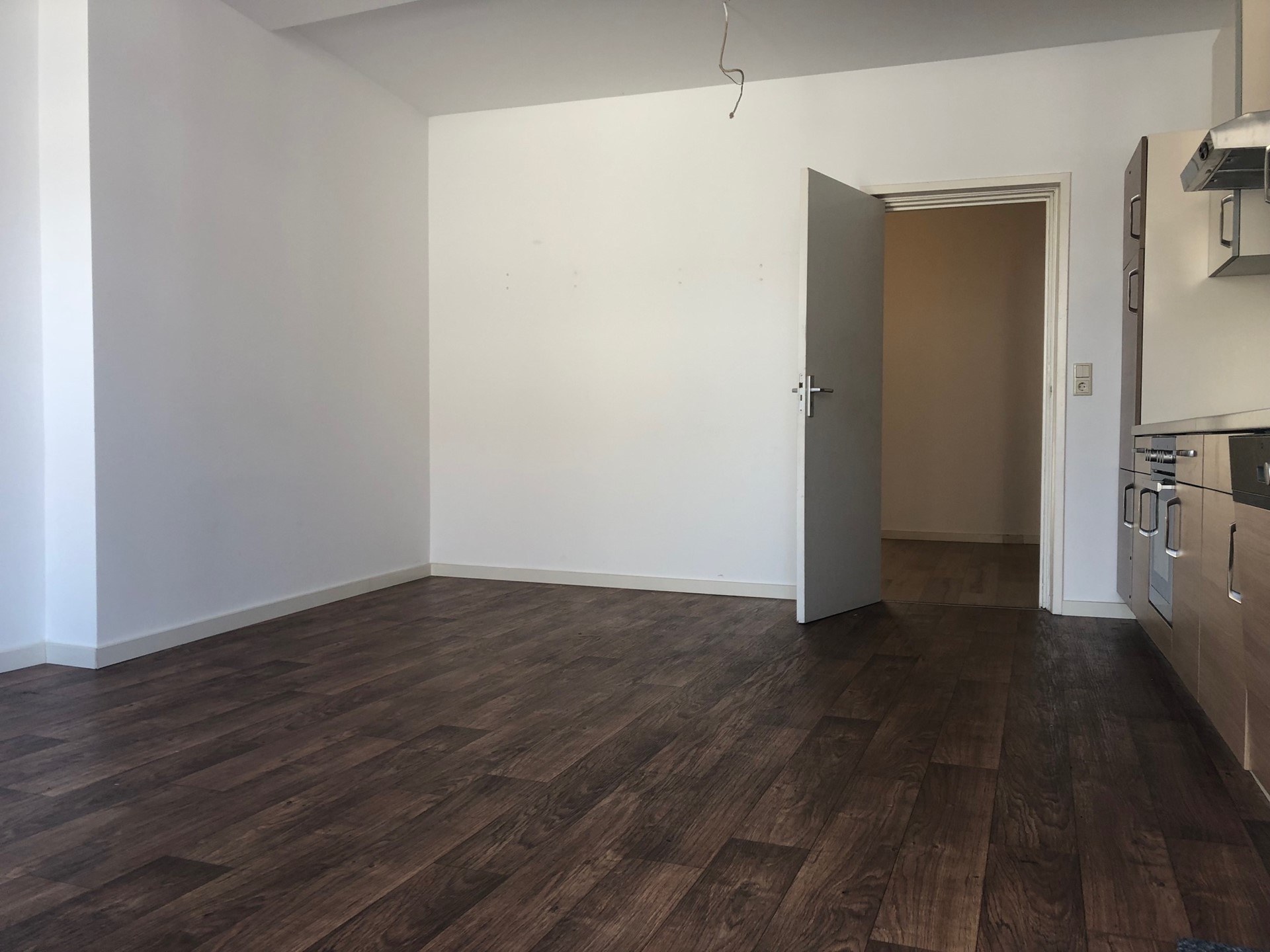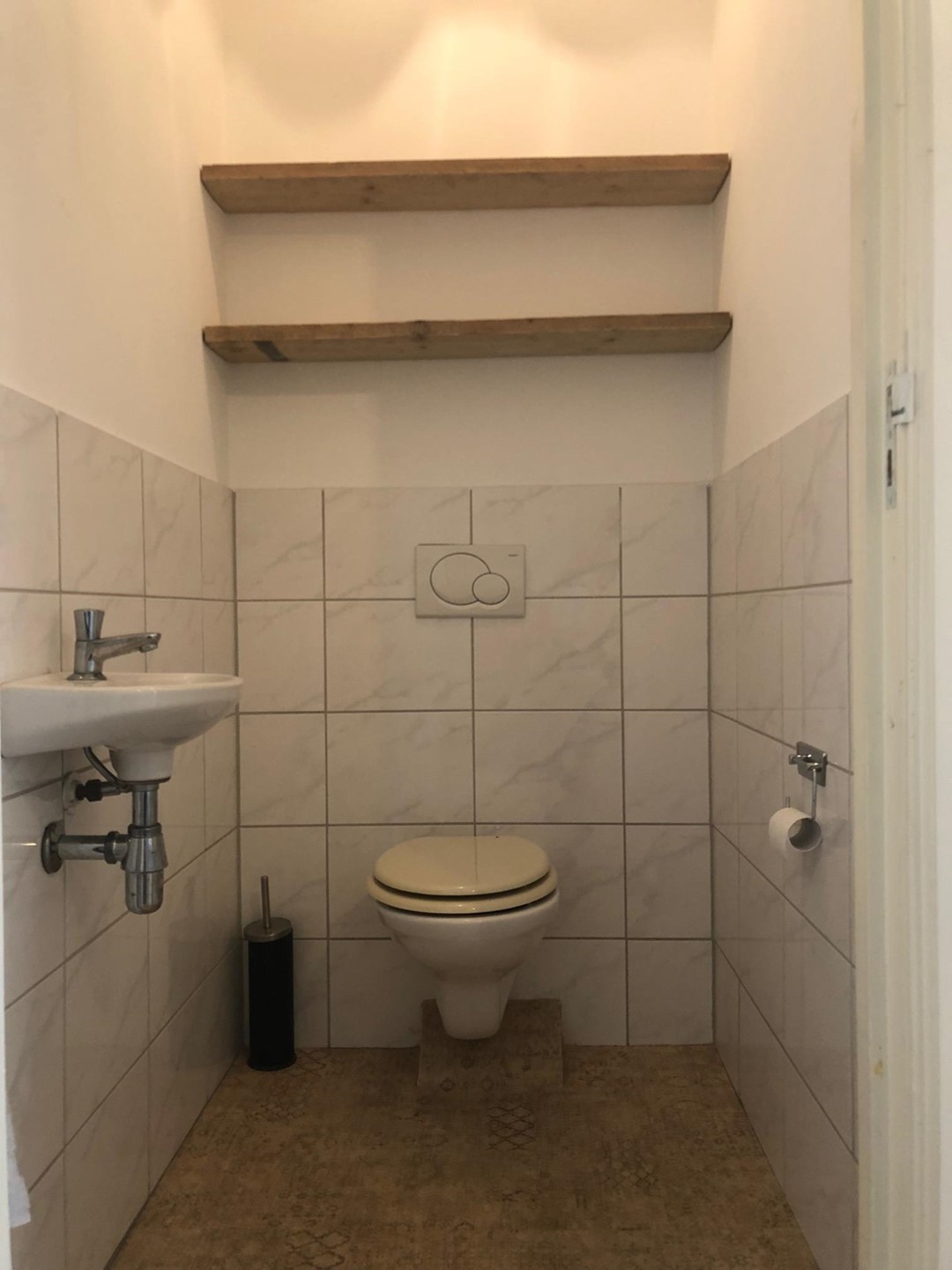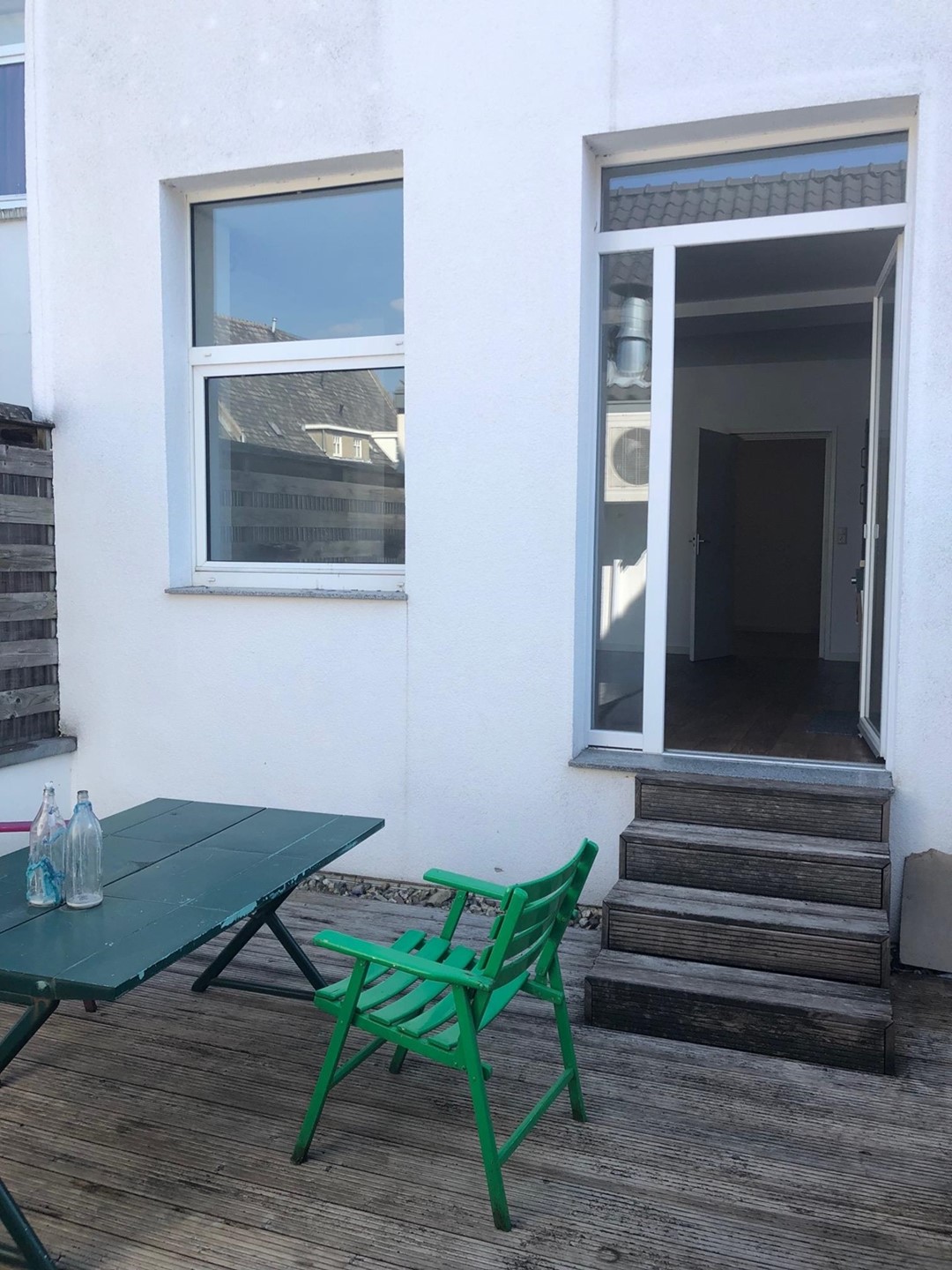 Landing with toilet. The living room is located at the front of the apartment. At the rear is the spacious kitchen, which provides access to the enclosed roof terrace. The kitchen is equipped with an oven, dishwasher, refrigerator, cooktop, and extractor fan.