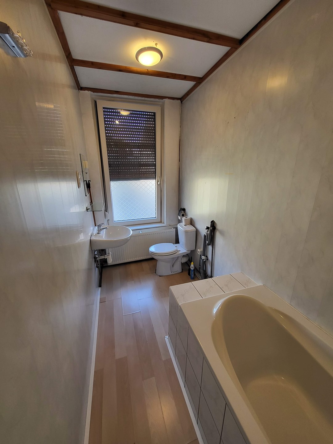 The bathroom is accessible from the living room / bedroom and has a bath, sink, toilet and the connection for the washing machine.