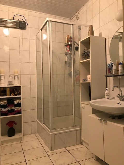 Ruime badkamer met douche, wastafel, toilet en wasmachine aansluiting.