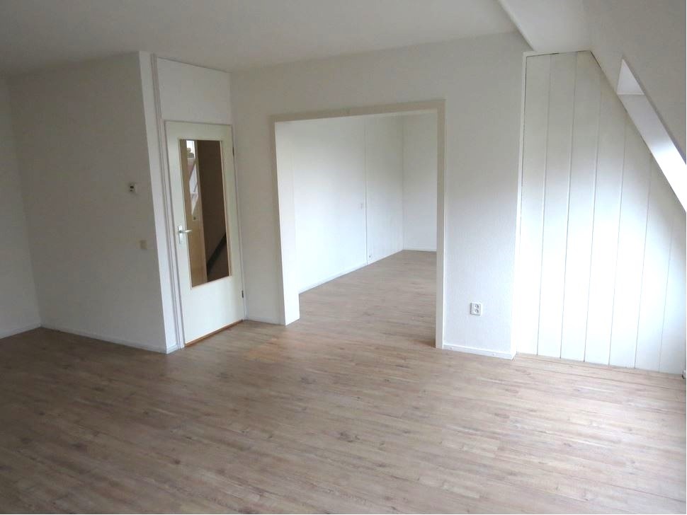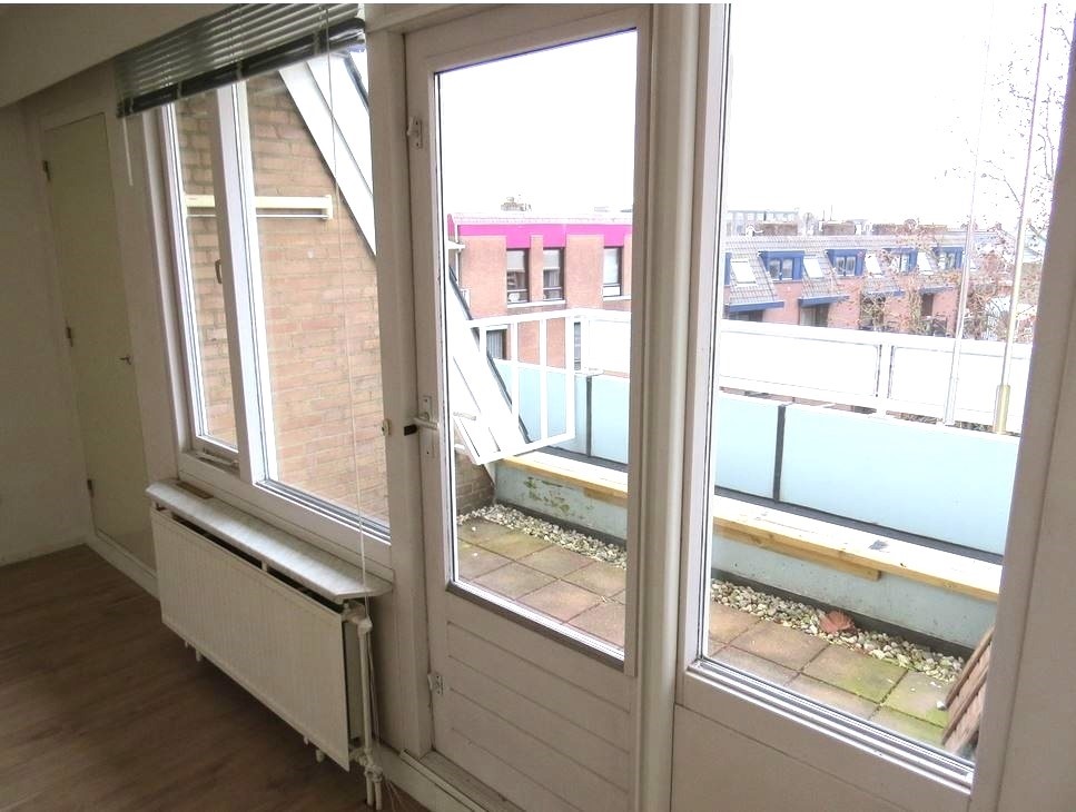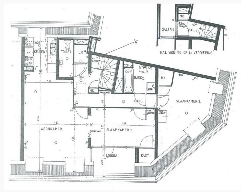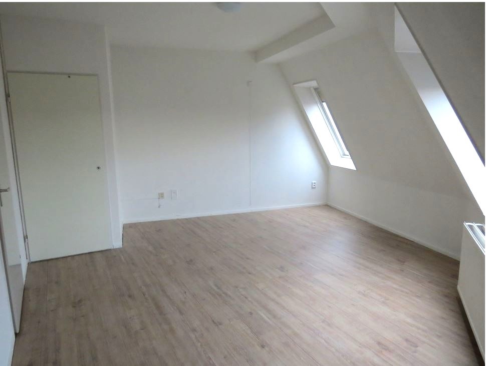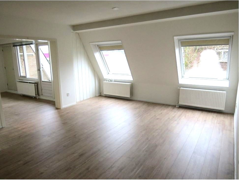Na trap opkomst komt u terecht in de L-vormige hal vanwaar u toegang heeft tot alle vertrekken van dit speels ingedeelde appartement. Allereerst bereikt u de ruime woonkamer (ca. 32m²) met een 2 tal velux dakramen. De woonkamer staat in half-open verbinding met de keuken. Aangrenzend bevindt zich de eerste slaapkamer (ca. 12,5m²) met bergkast. Vanuit deze slaapkamer heeft u toegang tot uw loggia c.q. balkon.