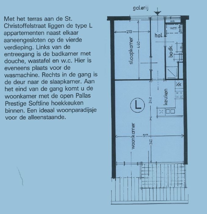 Links van de entreegang is de badkamer met douche, wastafel en toilet. Hier is eveneens plaats voor de wasmachine. Rechts van de gang is de deur naar de slaapkamer (ca.12m2). Aan het einde van de gang komt u de woonkamer met open keuken in hoekopstelling welke is voorzien van 4 pits fornuis, afzuigkap en oven. Vanuit de woonkamer heeft u toegang tot het balkon van ca 3m2.