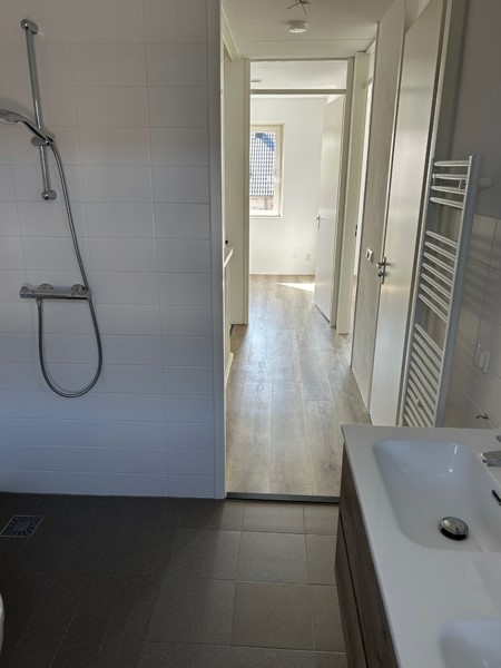 Op de eerste verdieping zijn 3 slaapkamers gesitueerd van ongeveer 6m2, 10m2 en 14m2. De betegelde badkamer heeft een douche, een vaste extra brede wastafel en een tweede toilet.