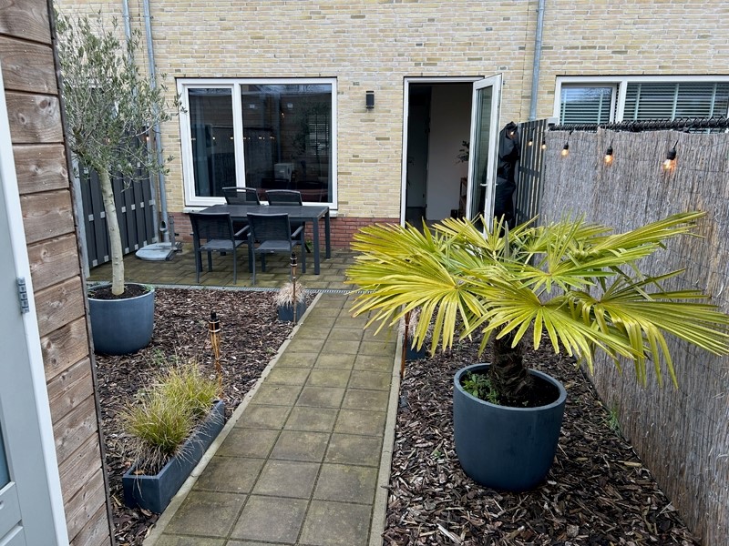 De achtertuin heeft een houten buitenberging van 5m2 en een vrije achterom. In de buurt van de huurwoning liggen voldoende parkeerplaatsen. De achtertuin is deels betegeld en mooi aangelegd.